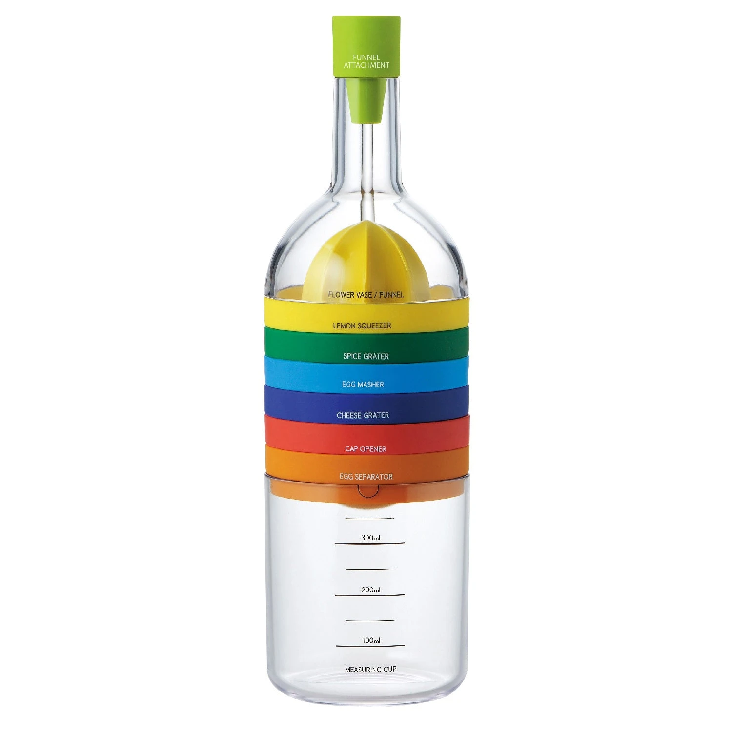 - Components: Funnel, lemon squeezer, grater, egg crusher, cheese grater, cap opener, yolk remover, measuring cup (420 mL).